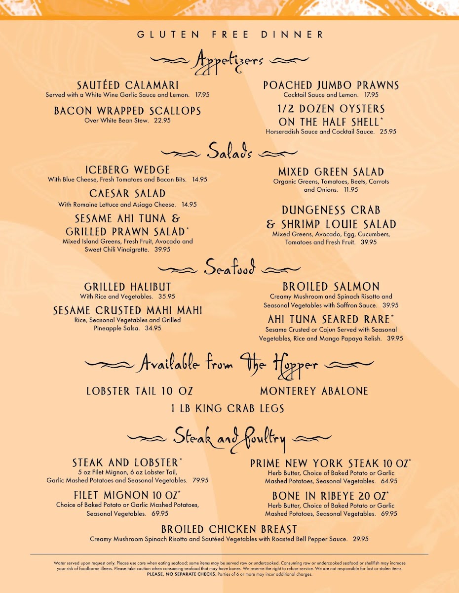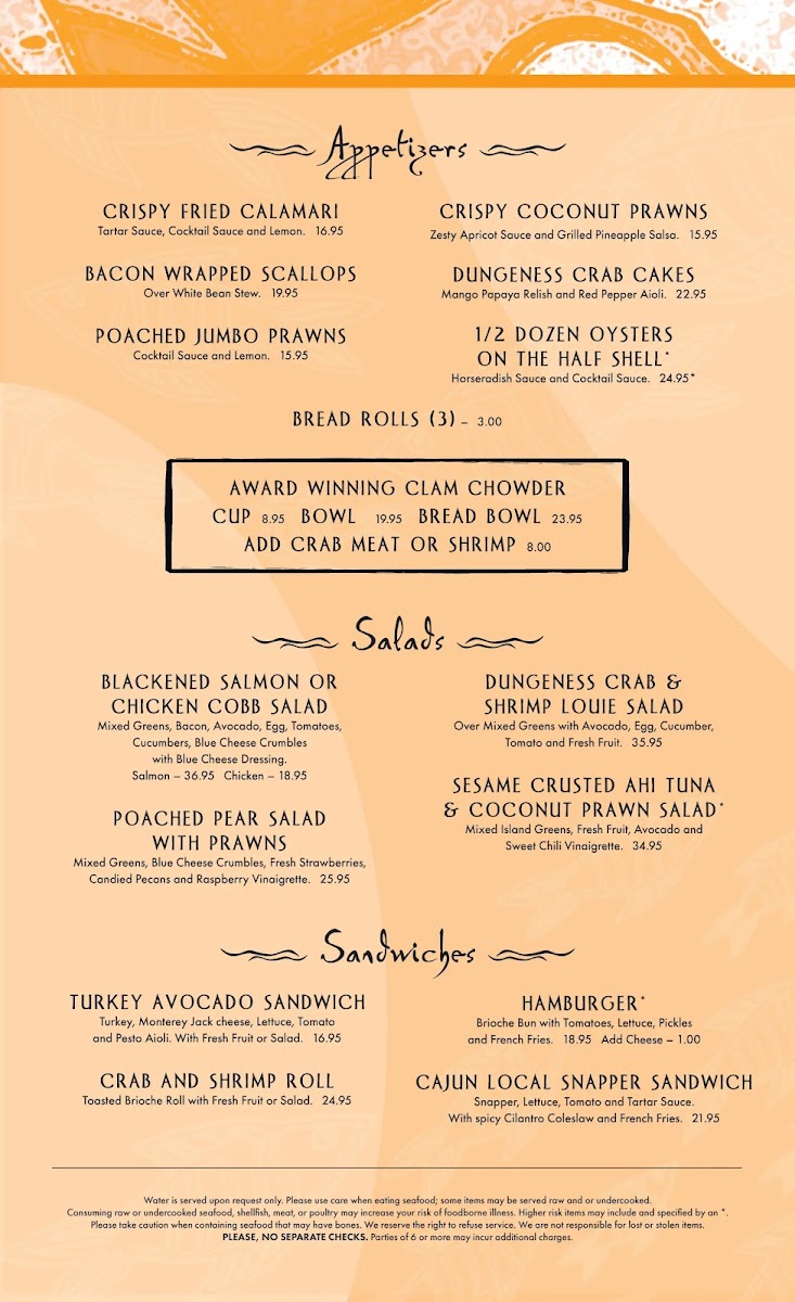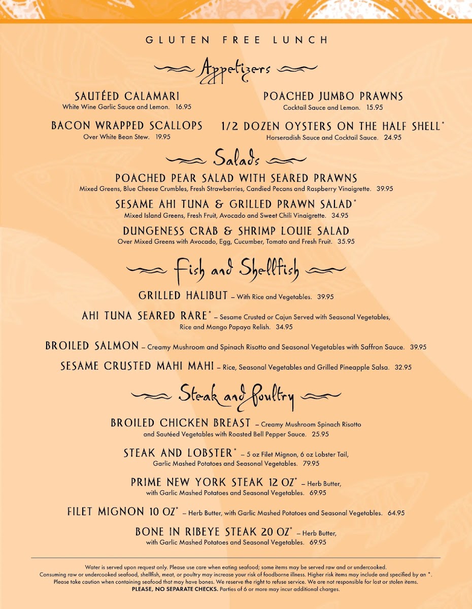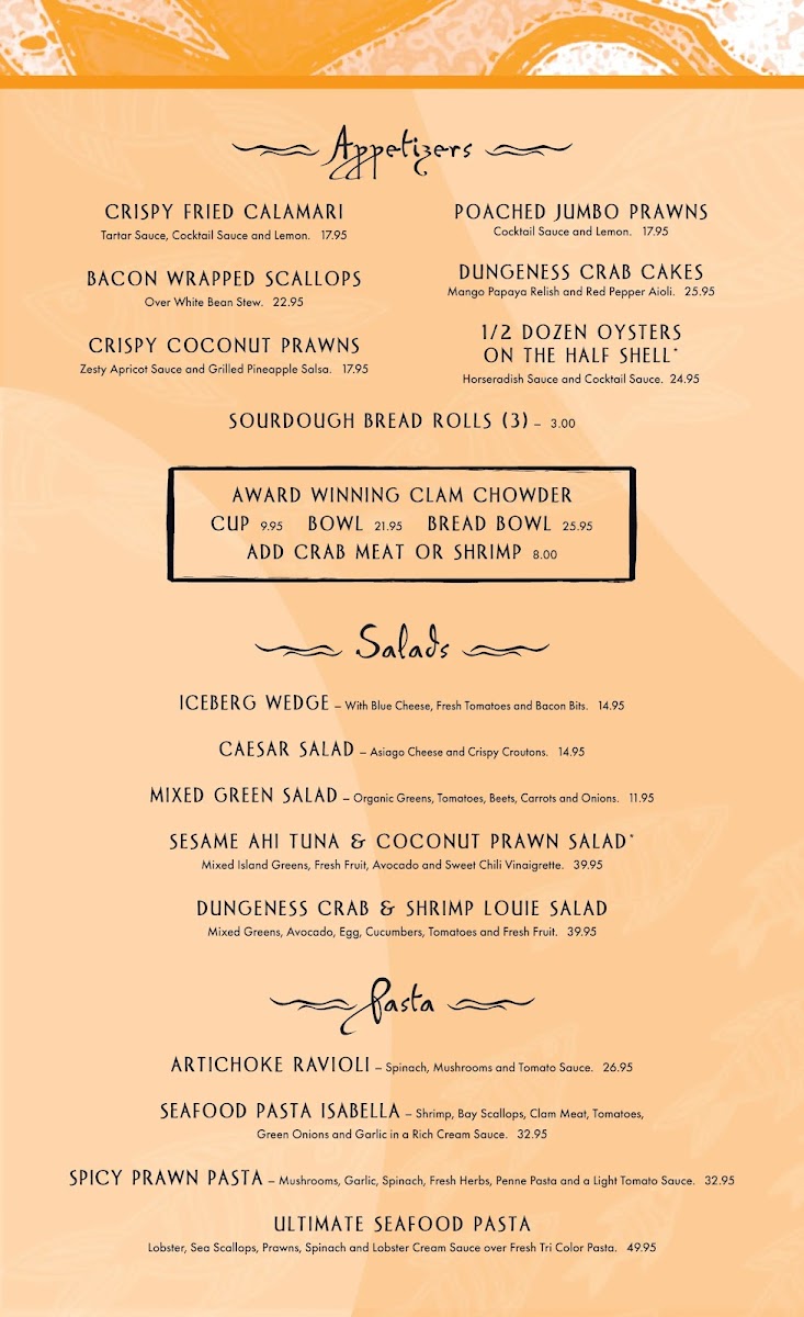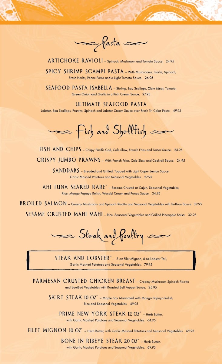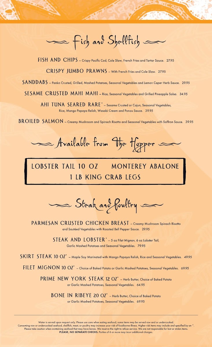 As you dive deeper into the menu, you'll find expertly prepared entrées like the Fish and Chips, featuring crispy Pacific cod served with tangy cole slaw and homemade tartar sauce for US$26.95. The Ahi Tuna is another highlight, seared to perfection and accompanied by seasonal vegetables and a tantalizing mango papaya relish for US$28.95. For a lighter touch, the Poached Pear Salad with prawns and candied pecans offers a delightful combination of flavors and textures for US$27.95.